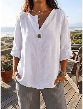 Dames Blouse Katoenen shirt Ruche Knop Effen Kleur Effen Dagelijks Stijlvol Basic 3/4 mouw V-hals Lange tops Casual Dagelijks blauw Zwart Wit Geel Blozend Roze Zomer Lente Herfst