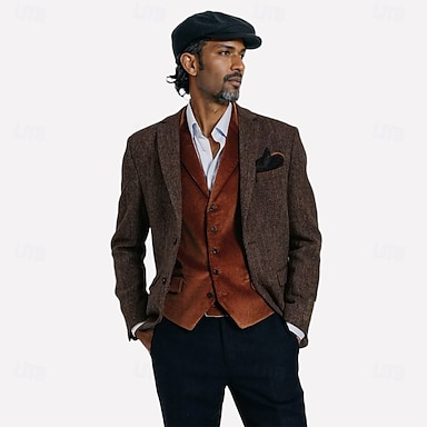 Voor heren Tweed blazer Inkeping kraag Vintage Retro vintage Visgraat Blazer Bruin Standaard pasvorm Enkele rij knopen met twee knopen