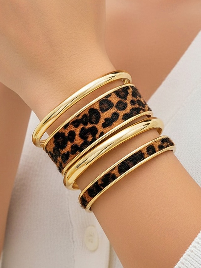 Dames manchetarmbanden met luipaardprint in goudkleurige legering – set van 4, stijlvol dierenprintontwerp, perfect voor casual en avondkleding#12432147