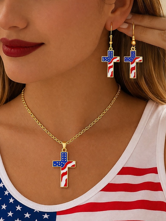 Damesketting en oorbellen met kruisje van legering, gouden en zilveren patriottische sieraden, oorbellen met hanger in de vorm van een Amerikaanse vlag, perfect voor de 250e verjaardag van de VS, Onafhankelijkheidsdag, casual kleding en vakantie. #18761710
