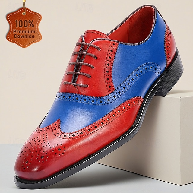 Geklede herenschoenen met vleugelneus van echt leer – premium rundleer, tweekleurig rood en blauw, elegante oxfordstijl, comfortabele formele schoenen voor heren, perfect voor bruiloften, feesten en kantoor. #9781814