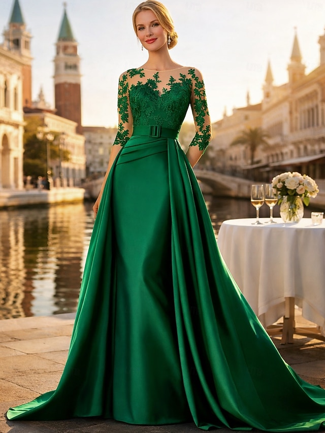 A-lijn Strijksleep Bruiloft gast jurk Formele jurk Avondjurk Moeder van de bruid jurk Lange mouw Met sieraad Elegant Zijdeachtig Kerstmis Formeel Satijn met Appliqués #16273761