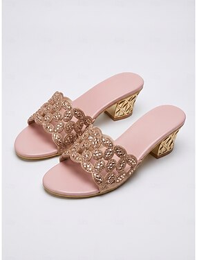 Roze slippers voor dames met strasssteentjes - elegante muiltjes met lage blokhak, geschulpte kristallen bandjes en goudkleurige geometrische uitgesneden hakken, perfect voor diners in resorts, gala-avonden en luxe cruises.