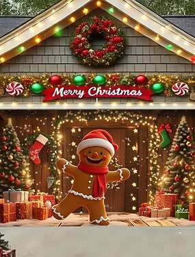 Kerst buiten garagedeurhoes peperkoekenman kerstboom kous cadeau kerstmuts groot wandtapijt achtergrond vakantie feest muurdecoratie voor buiten garagedeur huis festival viering decor