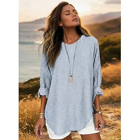 Dames Overhemd Imitatie katoenlinnen Lapwerk Gestreept Dagelijks Stijlvol Modern Lange mouw Strakke ronde hals Normale tops Dagelijks Vakantie Feest blauw Grijs Lente Herfst