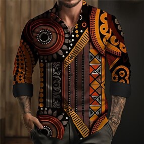 Voor heren Aztec Geometrisch patroon Tribal Overhemd met knopen Bedrukte overhemden Lange mouw Boho Vakantie Straat Paardenrace Lente zomer Strijkijzer Afdrukken Button-omlaag Geel Khaki