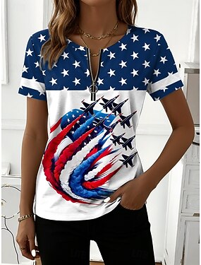 Amerikaanse onafhankelijkheidsdag Dames T-shirt Vetoketju Grafisch Amerikaanse vlag Stijlvol Klassiek Casual Korte mouw Strakke ronde hals Normale tops Dagelijks Weekend blauw Wit Rood Zomer Lente