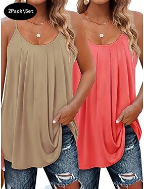 Multi-pakketten 2 stuks Dames V-hals Mouwloos Groen + roze Tank Mouwloos shirt T-shirt Geplooid Effen Kleur Casual Dagelijks Polyester Zomer