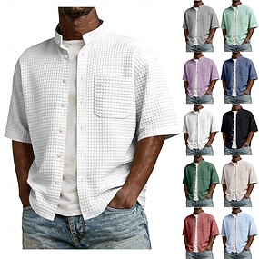 Voor heren Overhemd Wafel Shirt Normaal shirt Overhemd met knopen Zwart Wit Lichtgroen Blozend Roze Bordeaux Korte mouw Effen opa kraag Casual Dagelijks Voorvak Kleding Elegant Modieus Casual
