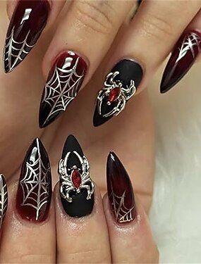 Halloween-persnagels, medium amandel, mabkjlf, spinnenbedels, nepnagels, rode gradiënt, nepnagels met spinnenwebontwerpen, zwarte matte acrylnagels, glanzende lijmnagels voor vrouwen en meisjes, 24