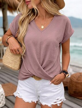 Dames Blouse Effen Modern Casual Korte mouw V-hals Normale tops Dagelijks Uitgaan Zwart Wit Blozend Roze Wijn Zomer Lente