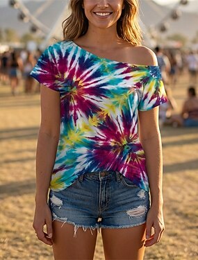 Retro vintage Jaren '80 T-Shirt Eén-schouder Korte mouwen Hippie Schijf Tie dye opdruk Kostuum Dames Halloween Carnaval muziekfestival Retro themafeest Volwassenen T-shirt