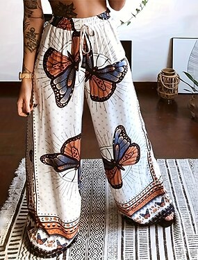 Dames Breed Been broek Streetwear Casual Volledige lengte Natuurlijk Vlinder Trekkoord Zak Afdrukken Comfortabel Buiten Vakantie Straat Zwart Wit Herfst Normale pasvorm