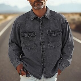 Voor heren Overhemd Zomer overhemd Normaal shirt Overhemd met knopen Denim overhemd Zwart blauw Lange mouw Effen Revers Vakantie Hawaii Voorvak Kleding Polyester Modieus Casual Comfortabel