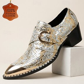 Witte gouden herenschoenen met slangenprint, gesp en spitse neus, metalen neuskap, formele schoenen voor bruiloften, banketten, feesten, gala's, mode-evenementen en stijlvolle avondkleding.