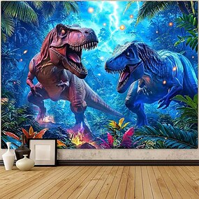 Fantasy jungle dinosaurus T-Rex wandtapijt blauw en rood Tyrannosaurus Rex bliksem hemel kinderkamer jongens speelkamer decoratie gamekamer achtergrond