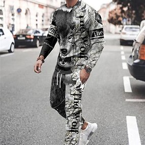 Voor heren Trainingspak Truien instellen Grijs Strakke ronde hals Grafisch dier Wolf 2-stuks Afdrukken Sport & Outdoor Casual Sport 3D-afdrukken Streetwear Sportkleding Basic Lente Herfst Kleding