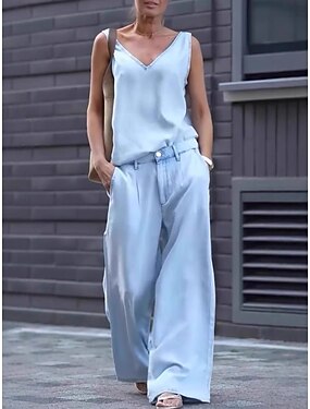 Dames Broeken Sets Bolero Top Mouwloos V-hals Effen Elegant Modieus Streetwear Dagelijks Vakantie Feestdagen Licht Blauw Zomer Ruim Passend