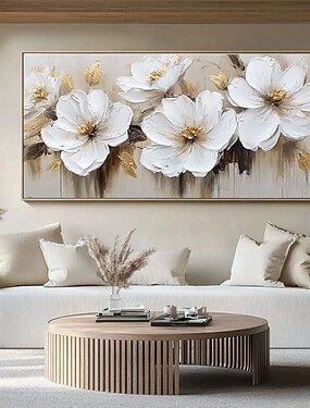 handgemaakte olieverfschilderij canvas wanddecoratie moderne abstracte lichte luxe gouden folie textuur witte pioenroos grote bloem voor woonkamer woondecoratie gespannen frame hangend schilderij /