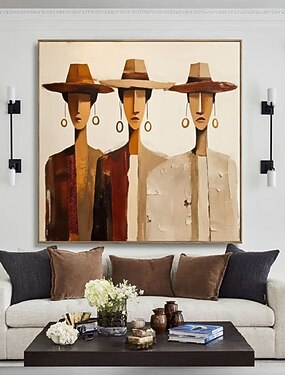 Origineel olieverfschilderij van een dame met hoed op canvas, groot abstract figuurschilderij met textuur, moderne wanddecoratie voor de woonkamer.