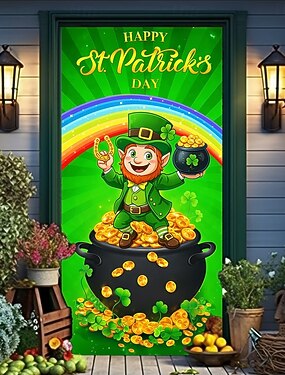 Deurbanner voor St. Patrick's Day, met Keltisch knoopmotief en klavertjes, de boodschap "Fijne St. Patrick's Day", feestelijke entreeversiering voor de St. Patrick's Day-viering.