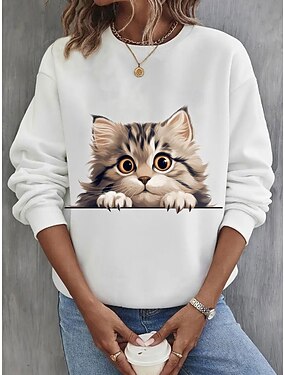 Dames Pullover Afdrukken Grafisch dier Kat Warm Klassiek Casual Lange mouw Strakke ronde hals Normale tops Casual Huis Straat Zwart Wit Blozend Roze khaki Lente Herfst Winter