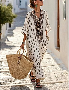 Dames Maxi-jurk Zonnejurk Casual jurk A lijn jurk Elegant Vakantie Stijlvol Strand Feestdagen Normale pasvorm Grafisch Geometrisch Stip Mouwloos V-hals Wit Geel Zomer Lente