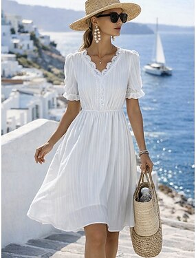 Dames Mini-jurk Witte kanten jurk Elegant Modieus Modern Buiten Vakantie Uitgaan Normale pasvorm Effen Korte mouw V-hals Wit Zomer Lente