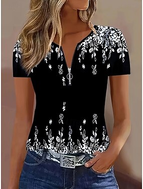 Dames T-shirt Kwart ritssluiting Bloemig Grafisch Planten Tropisch Hawaii Stijlvol Korte mouw Strakke ronde hals Normale tops Dagelijks Sport Uitgaan Zwart Rose Roze Zomer Lente