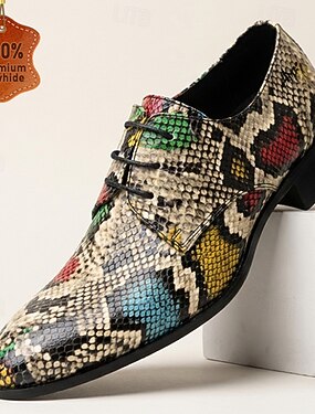Herenschoenen met veelkleurige slangenprint, vetersluiting, modieuze nette schoenen, een opvallend formeel schoeisel voor bruiloften, banketten, feesten, gala's, modeshows en een gedurfde avondstijl.