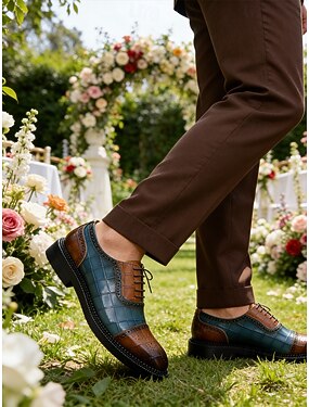Kleurrijke leren herenschoenen voor bruiloften - veelkleurige krokodillenprint, unieke en opvallende schoenen voor bruiloften en formele gelegenheden.