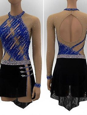 Kunstschaatsjurk Dames Schaatsen Jurken Zwart / blauw Lapwerk Open achterkant Hoge Elasticiteit Opleiding Wedstrijd Kunstschaatskleding Klassiek Kristal / Bergkristal Lange mouw Schaatsen
