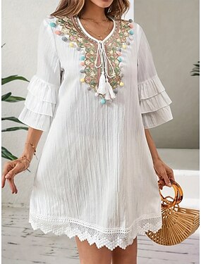 dames casual jurk boho kant detail v-hals driekwart mouw vintage patroon relaxte pasvorm beige bruin linnen mix lente herfst normale maat outdoor dagkleding