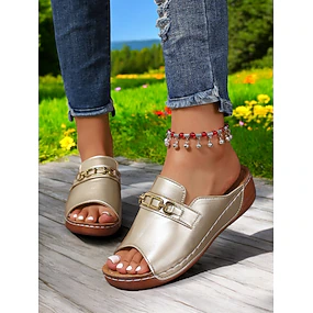 Dames gouden metallic slippers - open teen comfortabele sandalen met kettingdetail voor casual & zomerkleding