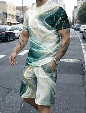 Voor heren Meetkundig 2 stuks T-shirts sets Zomer tops Korte mouw Korte broek Strakke ronde hals Casual / Dagelijks Buiten Vakantie Sport & Outdoor 3D-afdrukken Zomer blauw Paars Groen