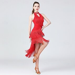 rode mouwloze asymmetrische dansjurk met franjes voor dames