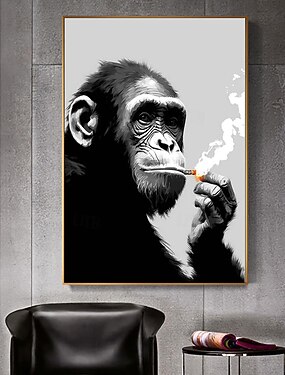 handgemaakt olieverfschilderij canvas kunst aan de muur decoratie pop zwart en wit dier abstract chimpansee roken voor huisdecor gerold frameloos niet-uitgerekt schilderij