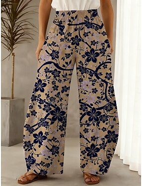 Dames Breed Been Broeken Vakantie Bohémien Casual Volledige lengte Hoge taille Bloemig Trekkoord Zak Elastische tailleband Comfortabel Comfort Ademend Micro-elastisch Casual Dagelijks Vakantie Khaki