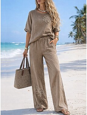 Dames Broeken Sets Bolero Imitatie katoenlinnen Halve mouw Ronde hals Bloemig Modieus Streetwear Casual Dagelijks Buiten Bruin Zomer Normale pasvorm