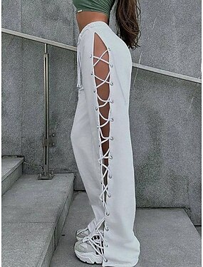Dames Breed Been Chinese Elegant Vintage Modieus Volledige lengte Middelhoge taille Effen Kleur Lapwerk Elastische tailleband Gat Comfortabel Ademend Inelastisch Dagelijks Buiten Vakantie Zwart Wit