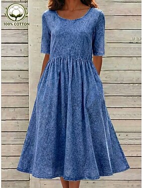 Vrouwen 100% Katoen Midi Jurk Faux Linnen Shift Jurk Zomer Jurk Vakantie Casual Dagelijks Losse Pasvorm Effen Halve Mouw Crew Neck Licht Blauw Zwart Wit Groen Zomer Lente Herfst