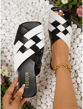 Bruine geweven slippers voor dames - casual, modieuze platte schoenen met open neus voor dagelijks gebruik, stranduitjes, buitenactiviteiten en zomerse uitstapjes.