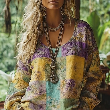 Dames Boho-T-shirt T-shirt Afdrukken Bloemig Kleurenblok Vintage Etnisch Casual Lange mouw V-hals Lange tops Dagelijks Weekend Vakantiekleding Geel Paars Zomer Lente Herfst
