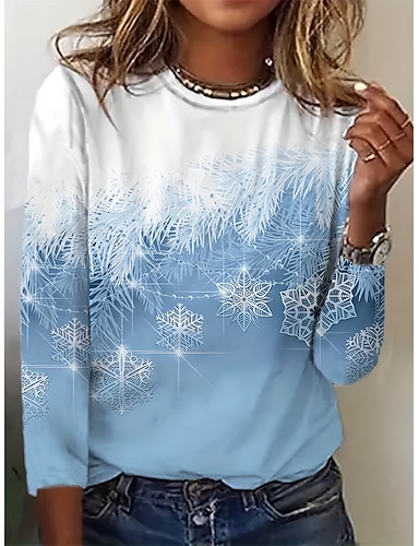 Kerst Dames T-shirt Grafisch Vintage Mode Stijlvol Lange Mouwen Crew Neck Reguliere Tops Dagelijks Weekend Print Blauw Lente Herfst Winter