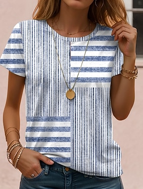 Dame T skjorte Trykt mønster Grafisk Geometrisk Stripet Årgang Stilfull Klassisk Kortermet Crew-hals Vanlige topper Daglig Blå Svart Hvit Marineblå Lilla Sommer Vår