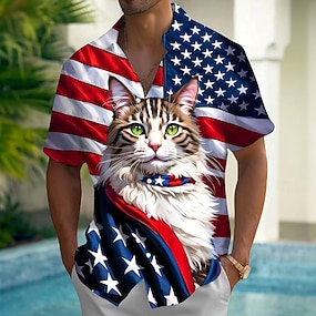 Herre Katt USAs flagg USAs 250-årsjubileum Skjorte Sommerskjorte Skjorte med knapper Kortermet Patriotisk utendørs Ferie Sommer Vår Aftæpning 3D-utskrift krage skjorter Front One Lomme Blå