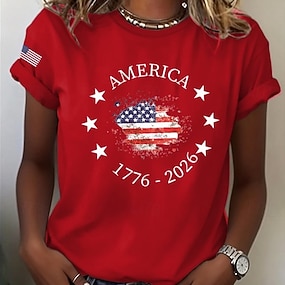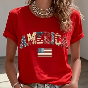 Amerikansk uavhengighetsdag Dame T skjorte Trykt mønster Grafisk Bokstaver Amerikansk flagg Stilfull Klassisk Fritid Kortermet Crew-hals Vanlige topper Daglig Svart Hvit Rød Sommer Vår