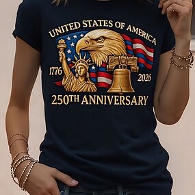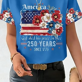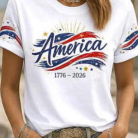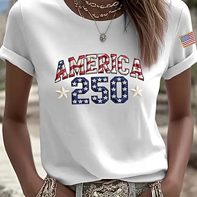 Uavhengighetsdagen Patriotisk Dame T-skjorte Print Grafisk Flagg Bokstav Stilig Klassisk Casual Kortermet Crew Neck Regular Topper Daglig Blå Svart Hvit Sommer Vår