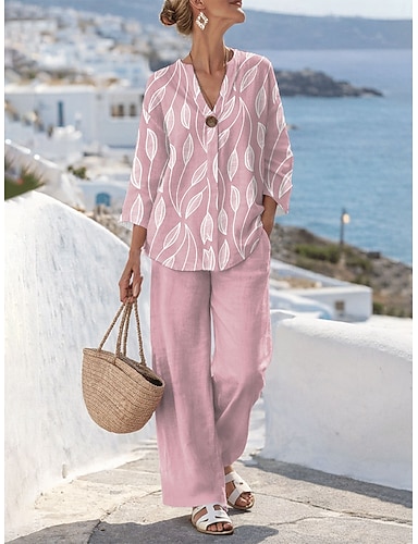 Kvinners to-delte sett linlignende bukser bolero topp 3/4 lengde ermer V-hals geometrisk print daglig stilig uformell daglig strand rosa blå grønn sommer løs passform