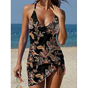 Kvinners ensfarget badedrakt med skjørt ferie strandtøy blomster grafisk U-utringning ermeless badedrakter
